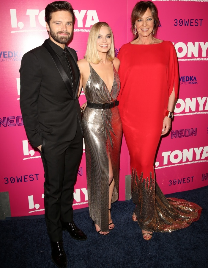 Former figure skater Tonya Harding, who was the inspiration behind the film, graced the L.A. premiere with her presence alongside her co-stars. Sebastian Stan looked handsome in his all-black ensemble with contrasting satin panels and glossy black leather dress shoes. Allison Janney looked ravishing in red, donning a Rani Zakhem Fall 2017 Couture gown with gold embellishments on the sweeping hem.
