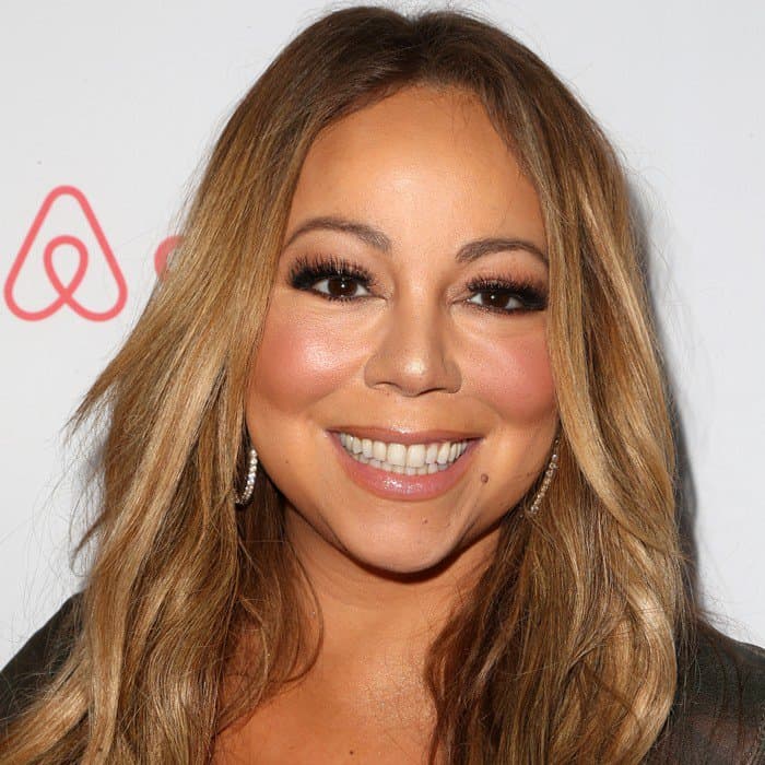 Mariah Carey enhances her glamorous look with soft, voluminous waves and a glowing makeup palette featuring neutral tones and a subtle smoky eye
