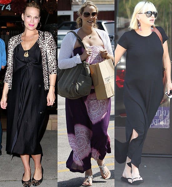 Pregnant celebrities Molly Sims, Elizabeth Berkley, and Anna Faris demonstrate the versatility of maxi dresses, blending comfort and elegance with chic maternity style