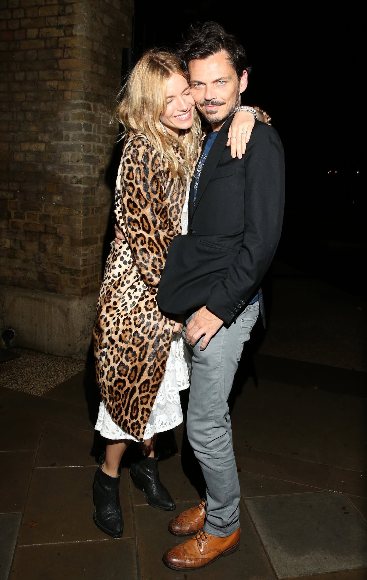 Sienna Miller grounds her leopard-print coat and lace dress with relaxed black ankle boots, while Matthew Williamson keeps things polished yet casual in tan leather brogues as they attend the Vogue party during London Fashion Week SS14 on September 15, 2013, in LondonSienna Miller grounds her leopard-print coat and lace dress with relaxed black ankle boots, while Matthew Williamson keeps things polished yet casual in tan leather brogues as they attend the Vogue party during London Fashion Week SS14 on September 15, 2013, in London (Credit: INFphoto)