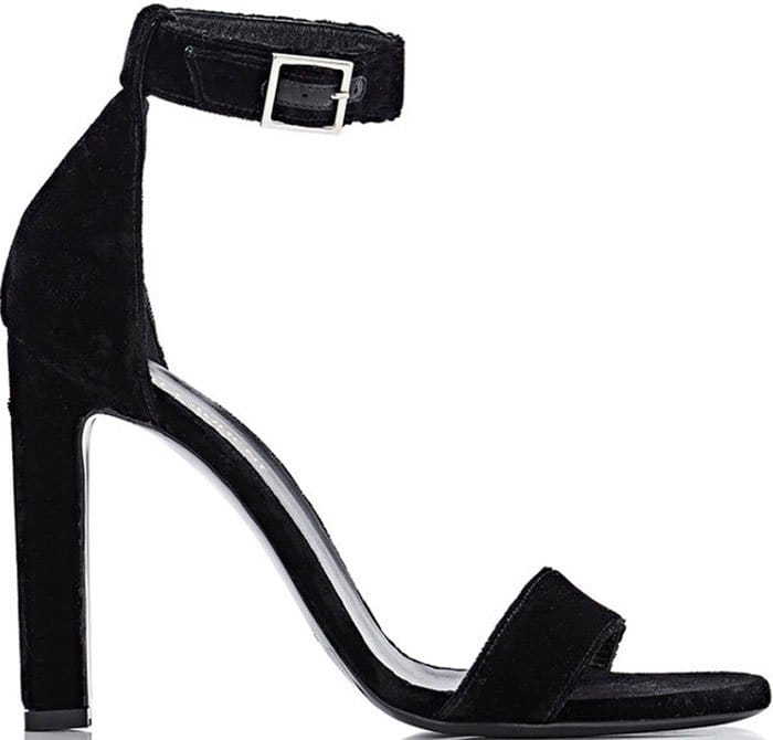 A classic pair of black suede sandals added almost five inches to her height. They have buckled ankle straps, open toes, and about 4.5-inch block heels.