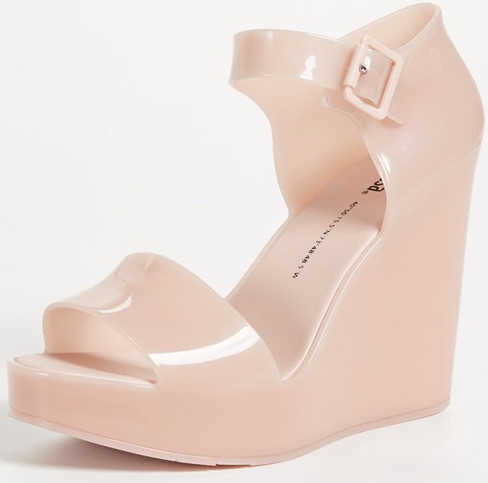 Take your look to new heights with this sleek, shiny platform wedge molded from water-resistant PVC and infused with the brand’s signature fruity scent.