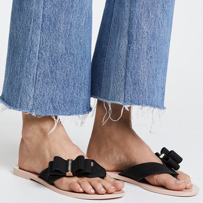 A curvy layered bow sits pertly on the textured strap of a wear-everywhere flip-flop designed in collaboration with celebrated fashion designer Jason Wu.
