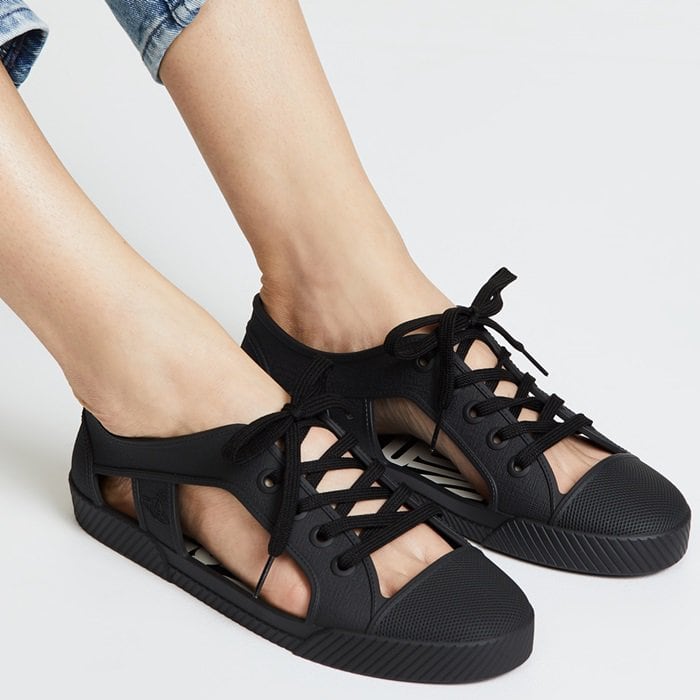 Perfect for beach walking or dramatic sidewalk strolling, a flexible low-top sneaker crafted from water-resistant PVC features a series of edgy cutouts.