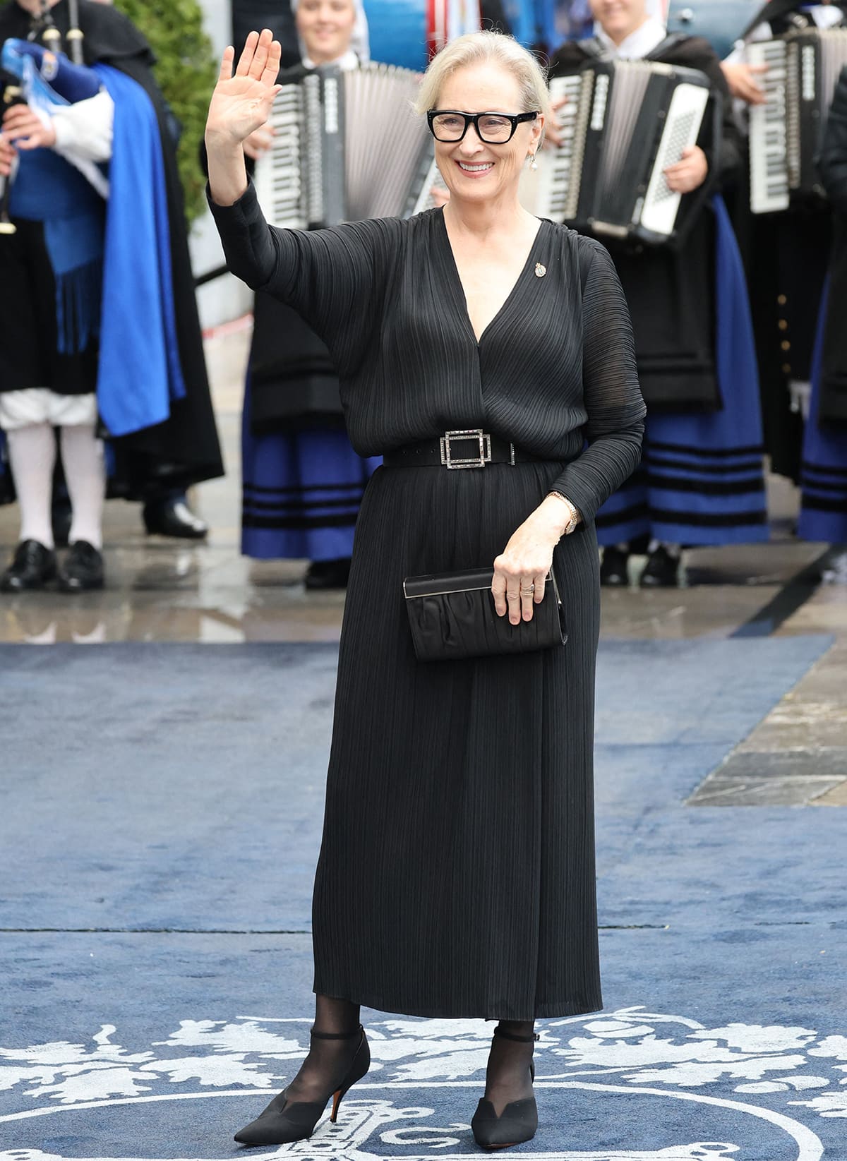 Streep opted for quiet luxury, wearing a black plissé dress with a plunging neckline, long sleeves, and an ankle-length hem. To help define her waist, the iconic actress wore a black belt with a crystal-encrusted buckle.