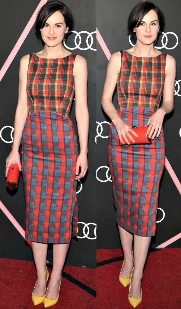 Fresh off hitting all the right notes in a fabulous Barbara Casasola creation at LoveGold’s Celebration of Gold and Glamour, the Downton Abbey star lit up Audi’s red carpet in a multicheck sleeveless sheath dress from Altuzarra’s Pre-Fall 2014 collection.