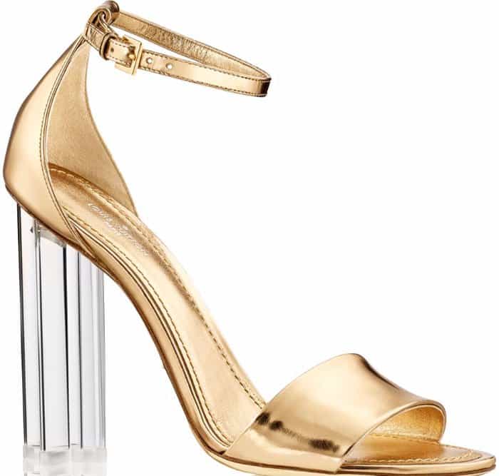 Louis Vuitton’s “Crystal Flower” sandals are available in both black suede and metallic leather:
