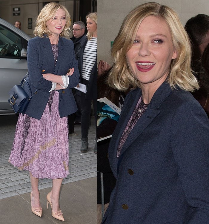 Kirsten embraced spring in yet another floral dress, this time from luxury label Gucci’s Resort 2016 collection. She picked a vintage-style lilac midi frock, which featured lace panels, a button front, and a pleated skirt.