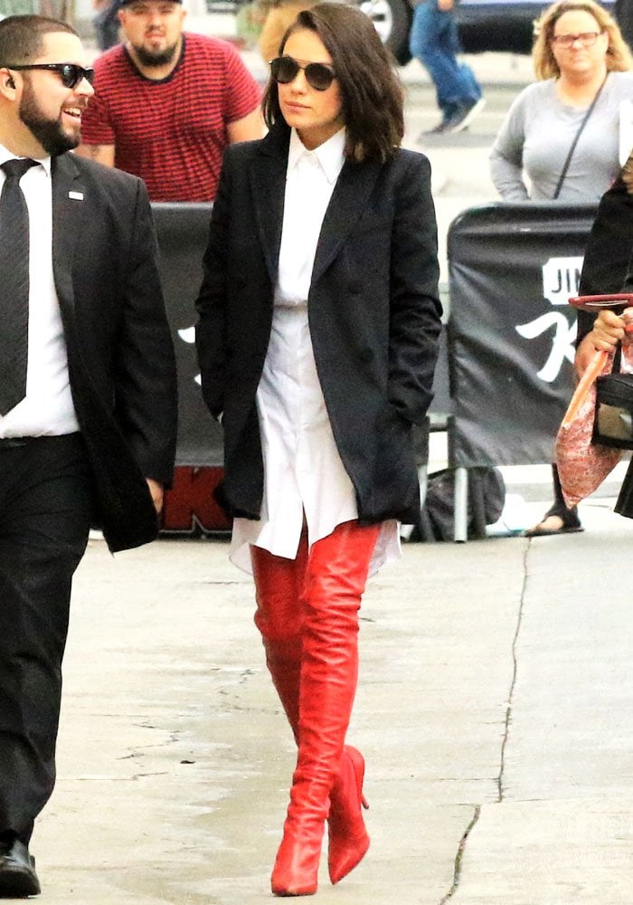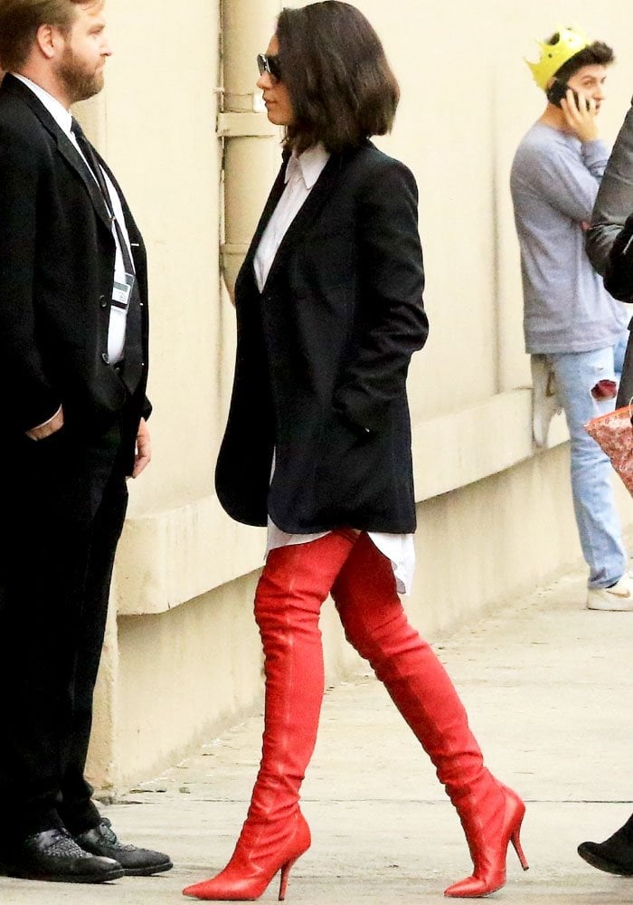 Mila arrived in a beautifully tailored Fendi blazer with a long buttondown shirt peeking from underneath. She completed a ridiculously sharp ensemble with the brand’s bright red “Rockoko” boots.