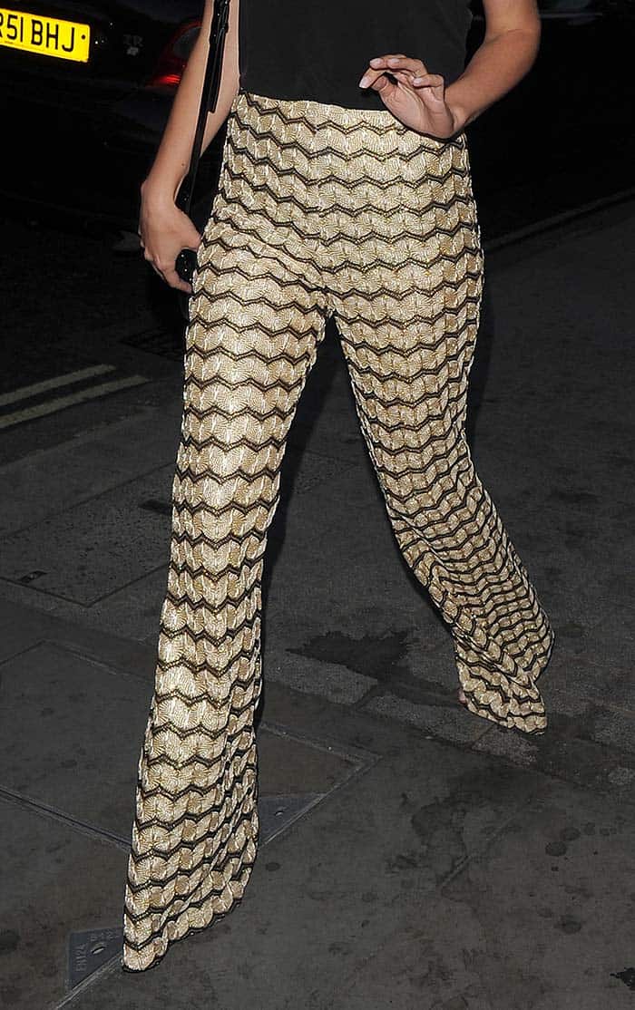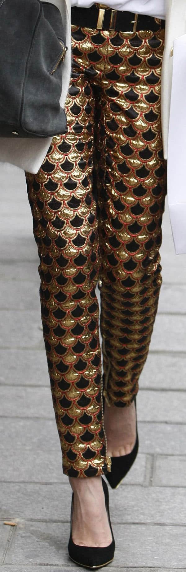 Miranda Kerr isn’t the only fashion-forward celebrity embracing the metallic jacquard trend. A few years later, English singer Mollie King also made a statement in a striking pair of gold flared trousers, proving that this eye-catching style remains a favorite among trendsetters.