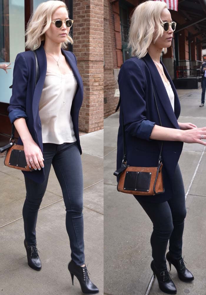 Jennifer later switched up her look to a laced camisole top paired with skinny jeans from Current / Elliott, which she dressed up with a blue shoulder-padded blazer.