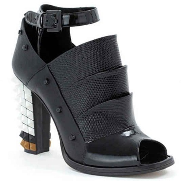 These shoes feature a combination of layered lizard-stamped leather and patent leather materials. Block heels with rubber pyramid studs complete these sandals.
