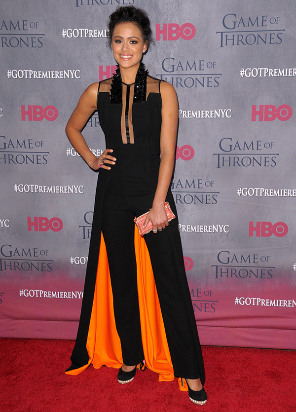 Nathalie Emmanuel stood out in a sea of stars at the New York premiere of the 4th season of ‘Game of Thrones’ held at Avery Fisher Hall in Lincoln Center in New York City on March 18. The English actress, who currently plays the role of a servant named Missandei in the said HBO fantasy drama series, was like royalty in a Georges Chakra Spring 2013 jumpsuit featuring sheer and beaded panels on the bodice and a dramatic orange-lined train.