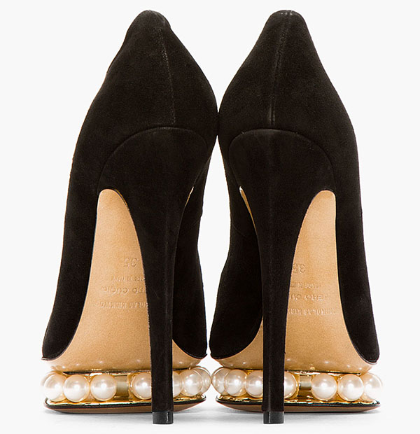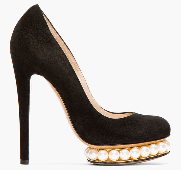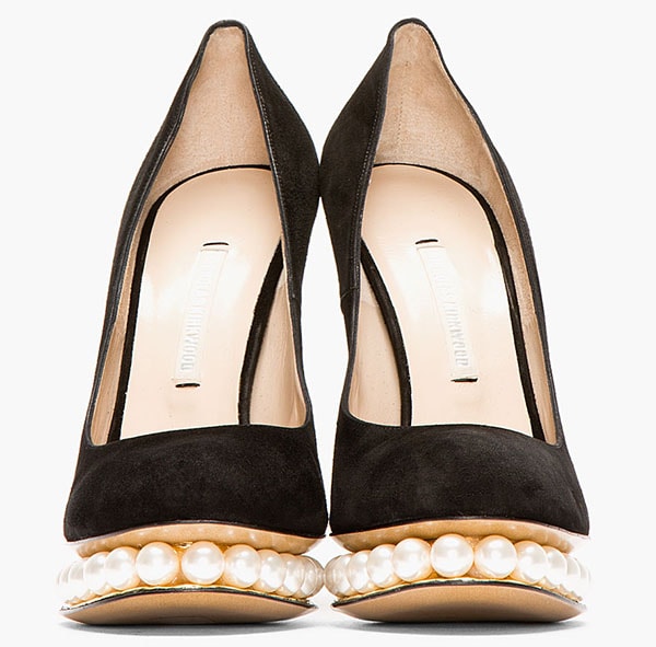 She was wearing a pair Nicholas Kirkwood pumps that feature faux pearl beads serving as the 1 inch platforms. Other than that, these pumps remain classic with round toes, low-cut vamps, and 5 inch covered heels.
