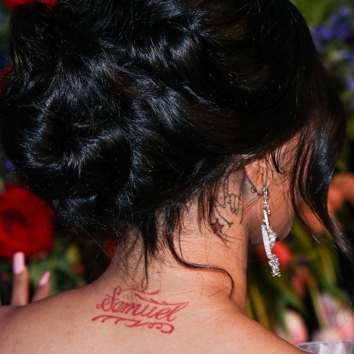 The popular rapper has the American sign language gesture for “I Love You” and a small black star inked behind her right ear. She also has the name “Samuel” in red ink tattooed just below her neck.