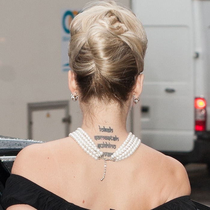 In August 2010, the Barbadian singer got a tattoo of the text “rebelle fleur” (rebel flower) written in script on the left side of her neck. She also has a trail of stars extending from her neck down her back.
