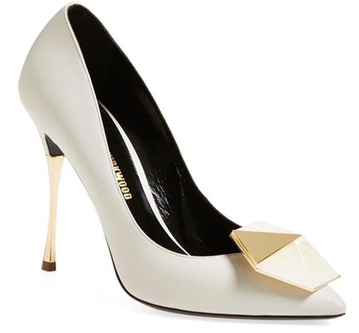 Enameled geometric hardware shines at the toe of a quintessential pump featuring laser-cut floral patterns that provide a dramatic, romantic finishing touch.