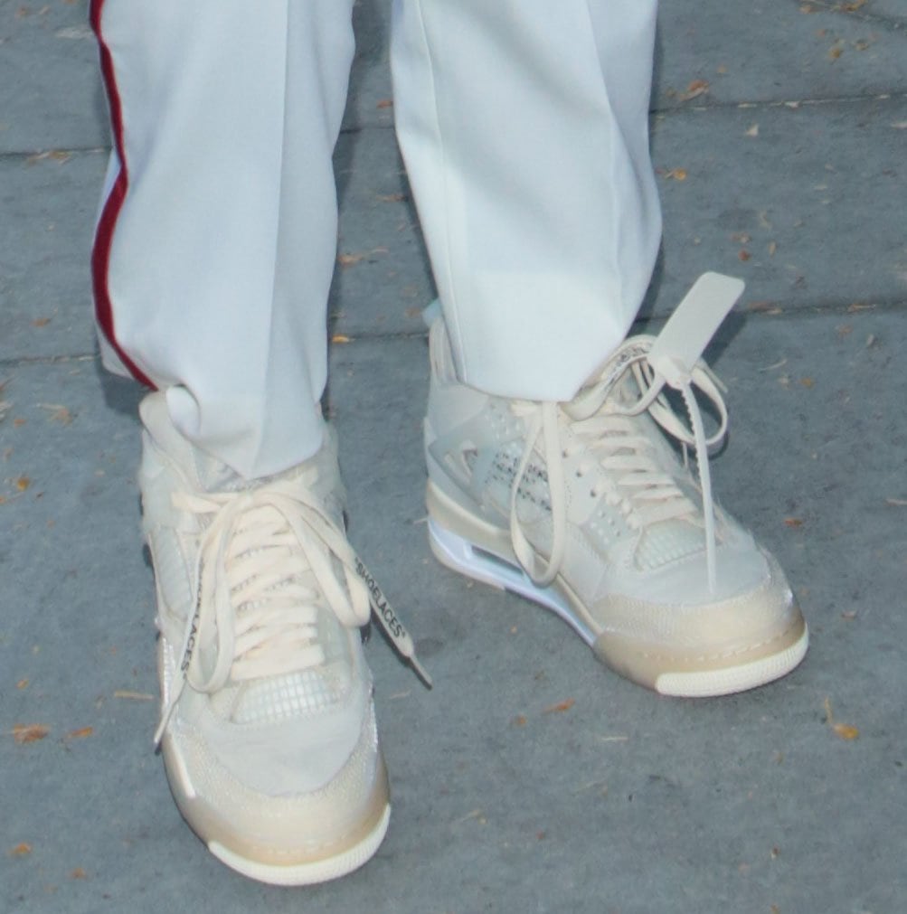 She wore the Sail colorway that was released in the summer of 2020. Virgil added his signature deconstructed design to this classic basketball silhouette, with full-grain leather, clear textile, and grid mesh upper.