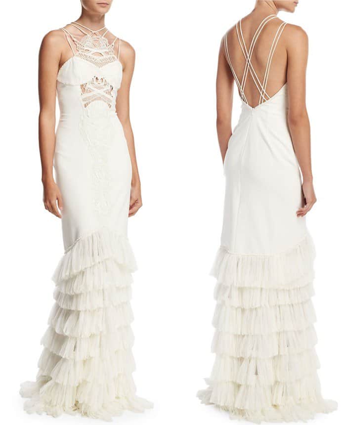 Her crepe dress features a guipure lace appliqué down the center front, a high neckline with a sweetheart illusion, and multiple crisscross spaghetti straps.