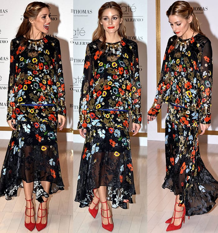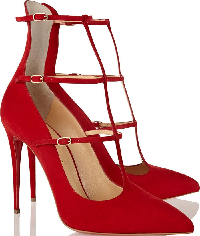 Olivia wore a pair of Christian Louboutin “Toerless Muse” pumps in red suede. They are sexy with a high back and pointed-toe silhouette, T-straps, tripled adjustable buckled straps, and 4-inch stiletto heels.