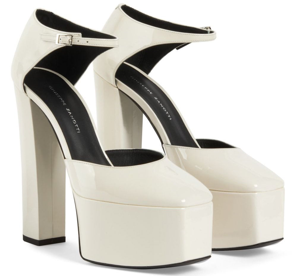 The towering platform sandals from Giuseppe Zanotti feature a buckled ankle strap, a closed square toe, a 2.7-inch platform, and a 6-inch sky-high block heel.