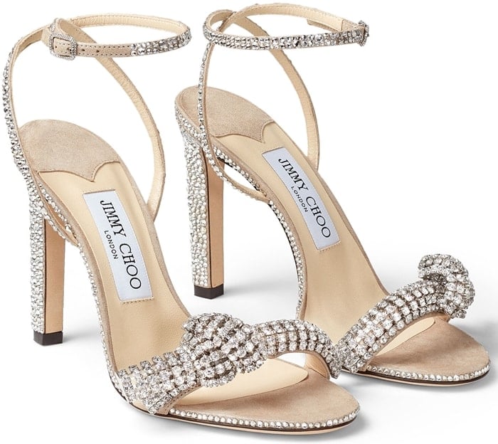 She showed off her feet in Jimmy Choo Thyra sandals with knotted crystal-encrusted embellishment at the Barker Hangar in Santa Monica, California.
