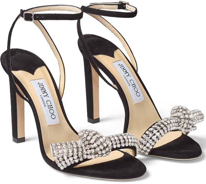 These breathtaking shoes, which are available in black, red, and nude, are sensuously detailed with a fine ankle strap that entwines the foot, and a coiled loop of sparkling pavé crystal cord trussed tight across the toe.
