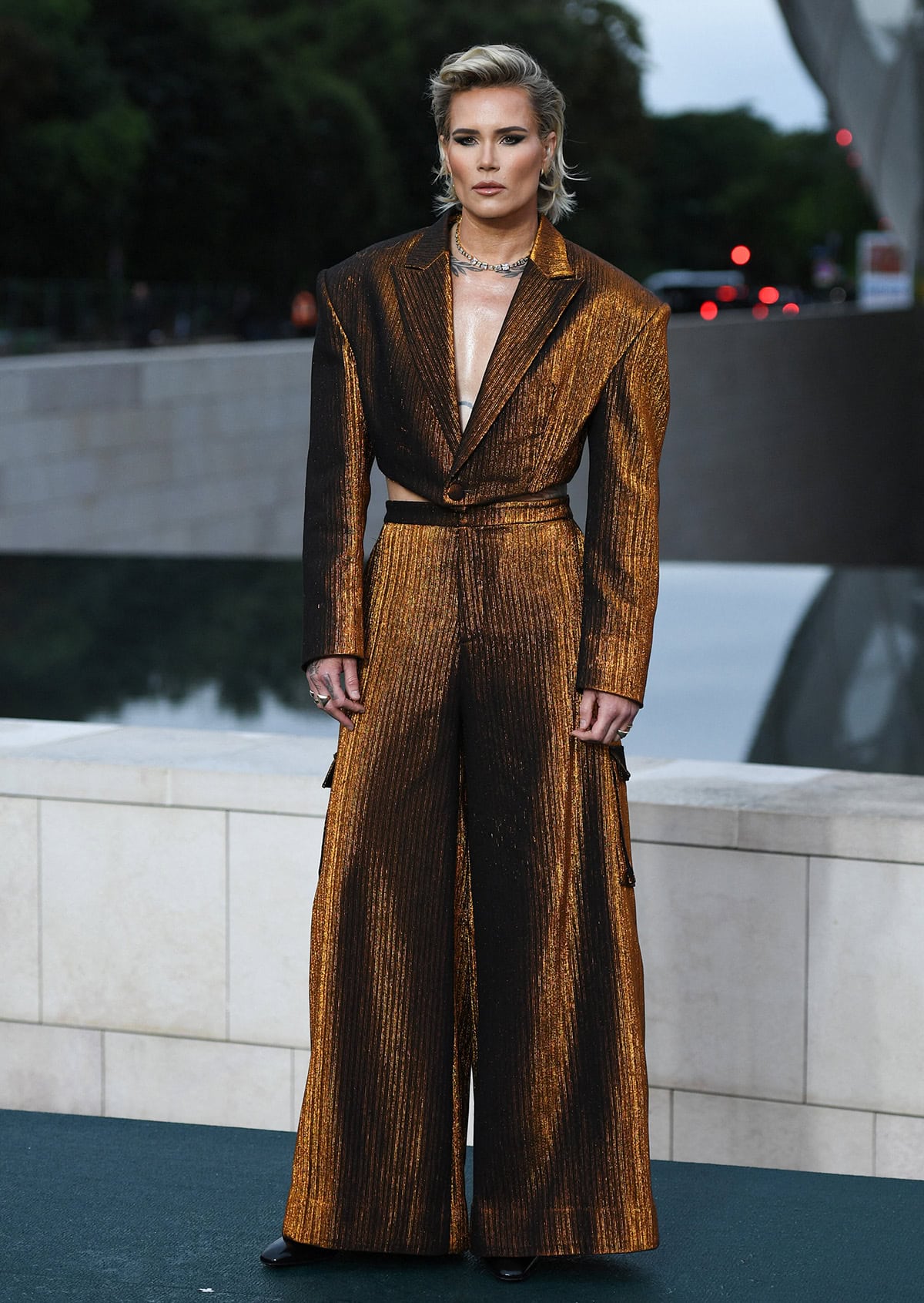Harris, meanwhile, shimmered in bronzed co-ords, featuring a cropped jacket with a plunging neckline and baggy cargo trousers.