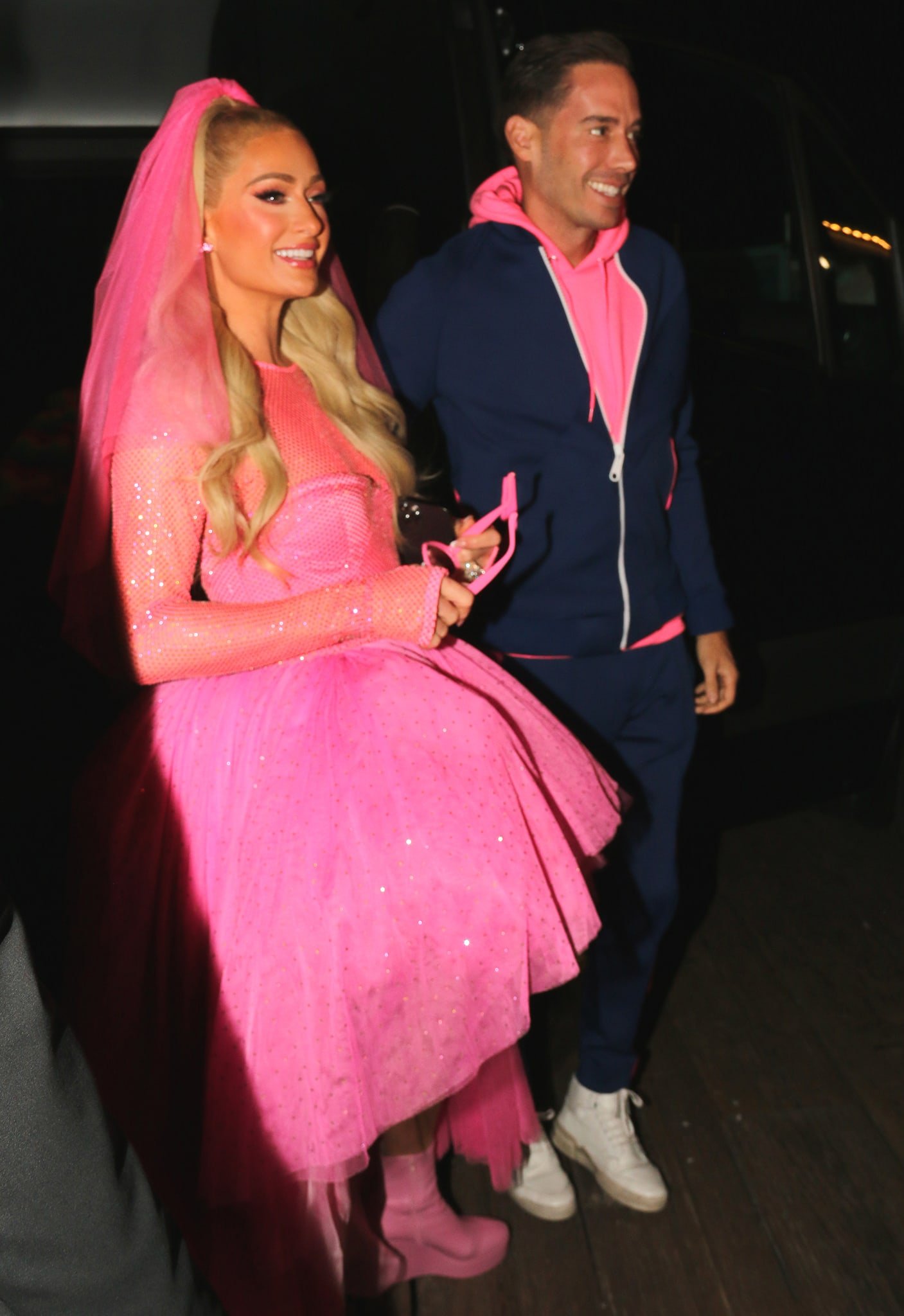 Channeling her inner Barbie, the socialite couldn’t be missed in head-to-toe neon pink that included a high-low tiered gown with mesh sleeves and a matching veil.