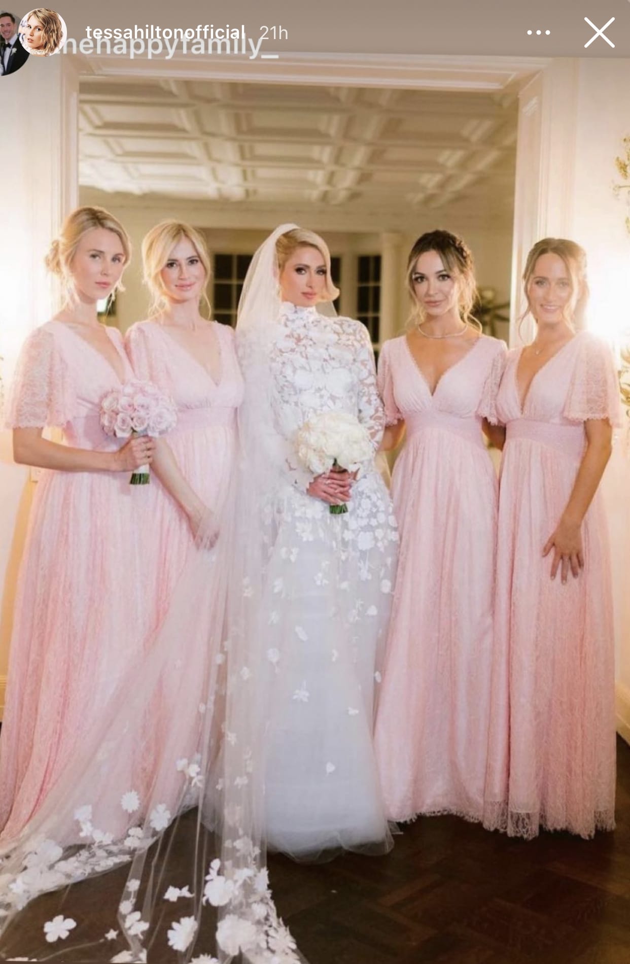 Meanwhile, her Maid of Honor, Nicky Hilton, and the rest of her bridesmaids wore pink lace dresses from Alice + Olivia.