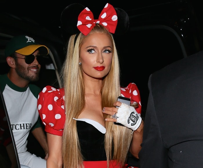 In October 2014, Paris Hilton flaunted her real boobs and cleavage in a Minnie Mouse costume while hitting a Halloween party at Mike Meldman’s residence in Beverly Hills, California.
