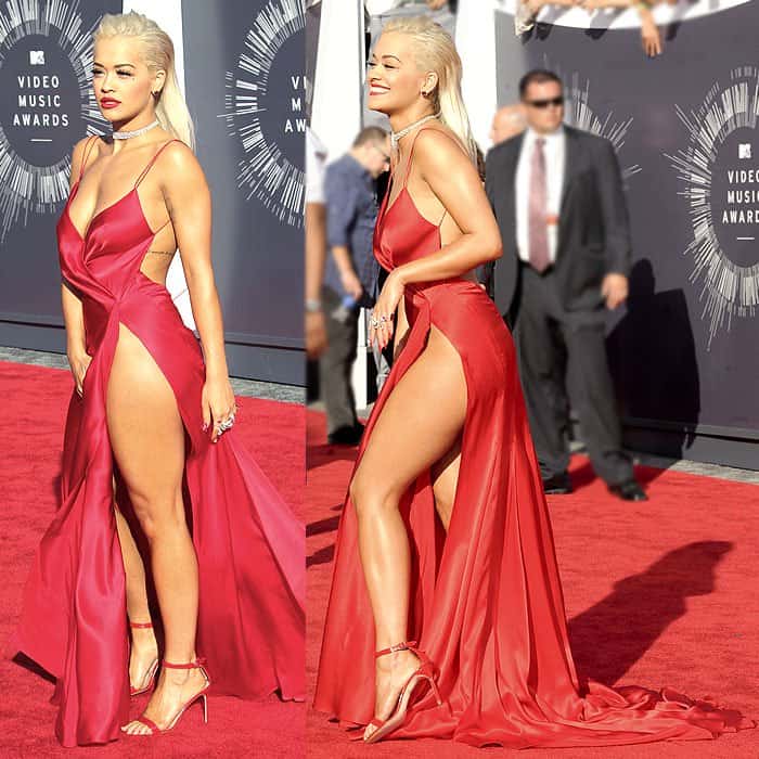 - 11. Rita Ora – Red Donna Karan Satin Gown & Matching Strappy Heels