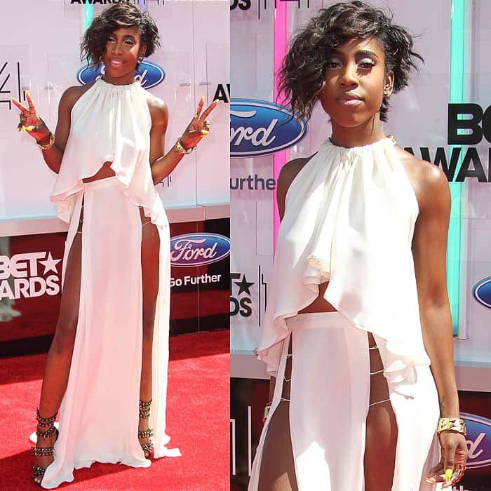 Sevyn Streeter delivered one of the boldest fashion moments at the 2014 BET Awards in a striking white two-piece ensemble that embodied the year’s red-hot “exposed hip” trend. The look paired a fluid, plunging halter top with a dramatic high-waist skirt engineered with twin waist-high slits that revealed her legs and hipbones with every step.