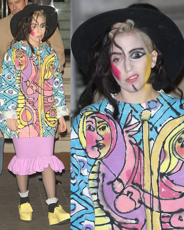 Lady Gaga wearing a Picasso-inspired outfit outside her hotel in London on December 6, 2013