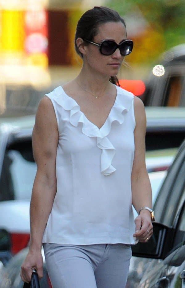 Pippa Middleton exudes sophistication in a white ruffle blouse and grey skinny jeans accented with oversized sunglasses