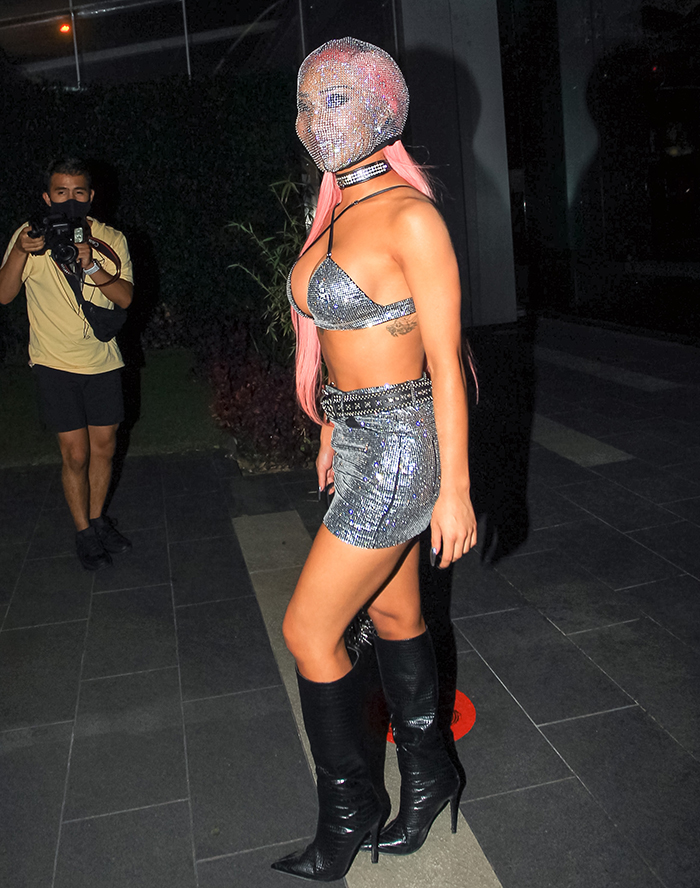 On her way to the restaurant, Nikita wrapped her head with a sparkly embellished mesh covering.