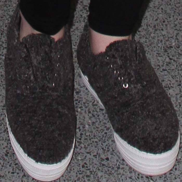 The pop star completed her travel look with a pair of shearling platform sneakers from New York-born footwear designer Joshua Sanders.