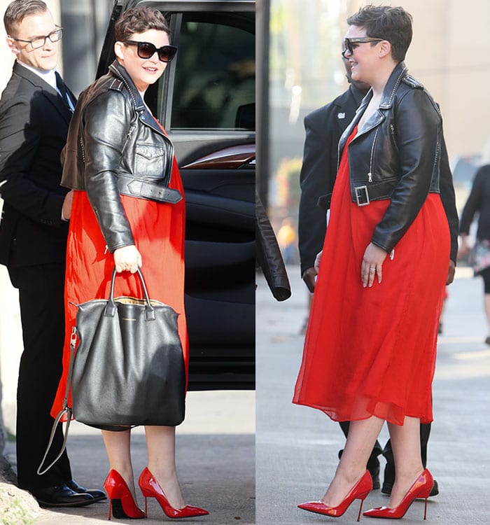 Ginnifer was radiant in a floaty red dress with a sweetheart neckline. She teamed the frock with a studded leather biker jacket and hid her eyes behind a pair of oversized black sunnies to add a hint of edge to the look.
