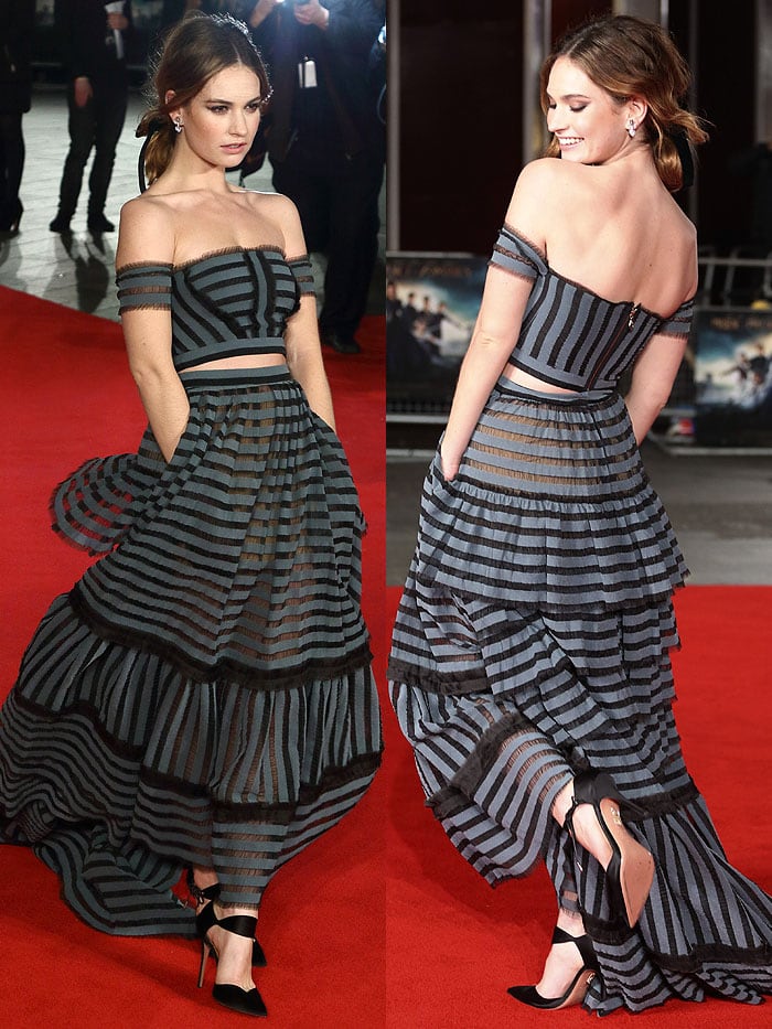 In February 2016, leading lady Lily James joined Suki Waterhouse on the red carpet of the “Pride and Prejudice and Zombies” premiere. Like Suki, the then 26-year-old British actress donned a nude illusion dress.