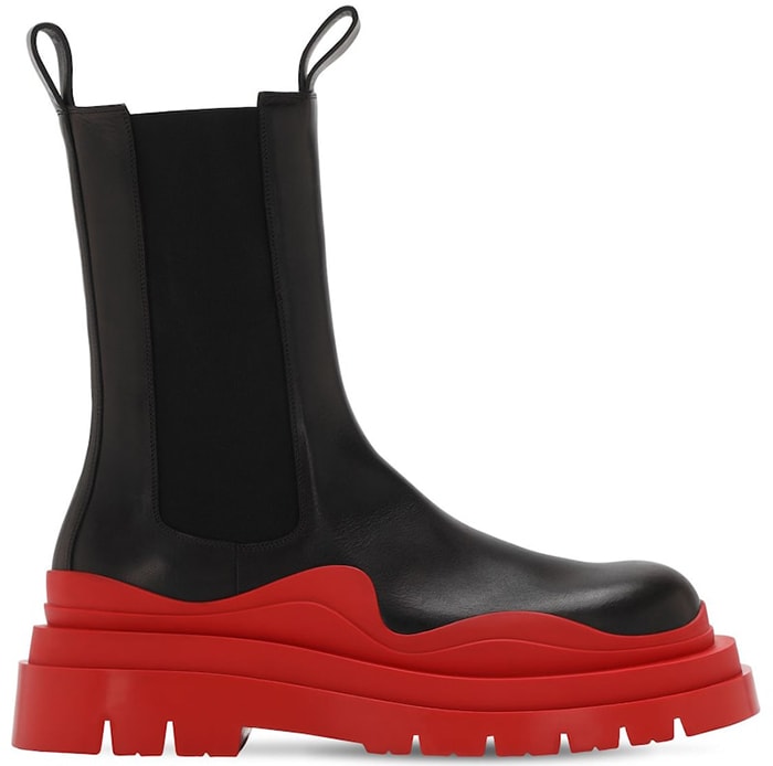 She then injected a pop of color to her look with a cherry red Balenciaga Hourglass bag, which matched the soles of her Bottega Veneta “Tire” boots.