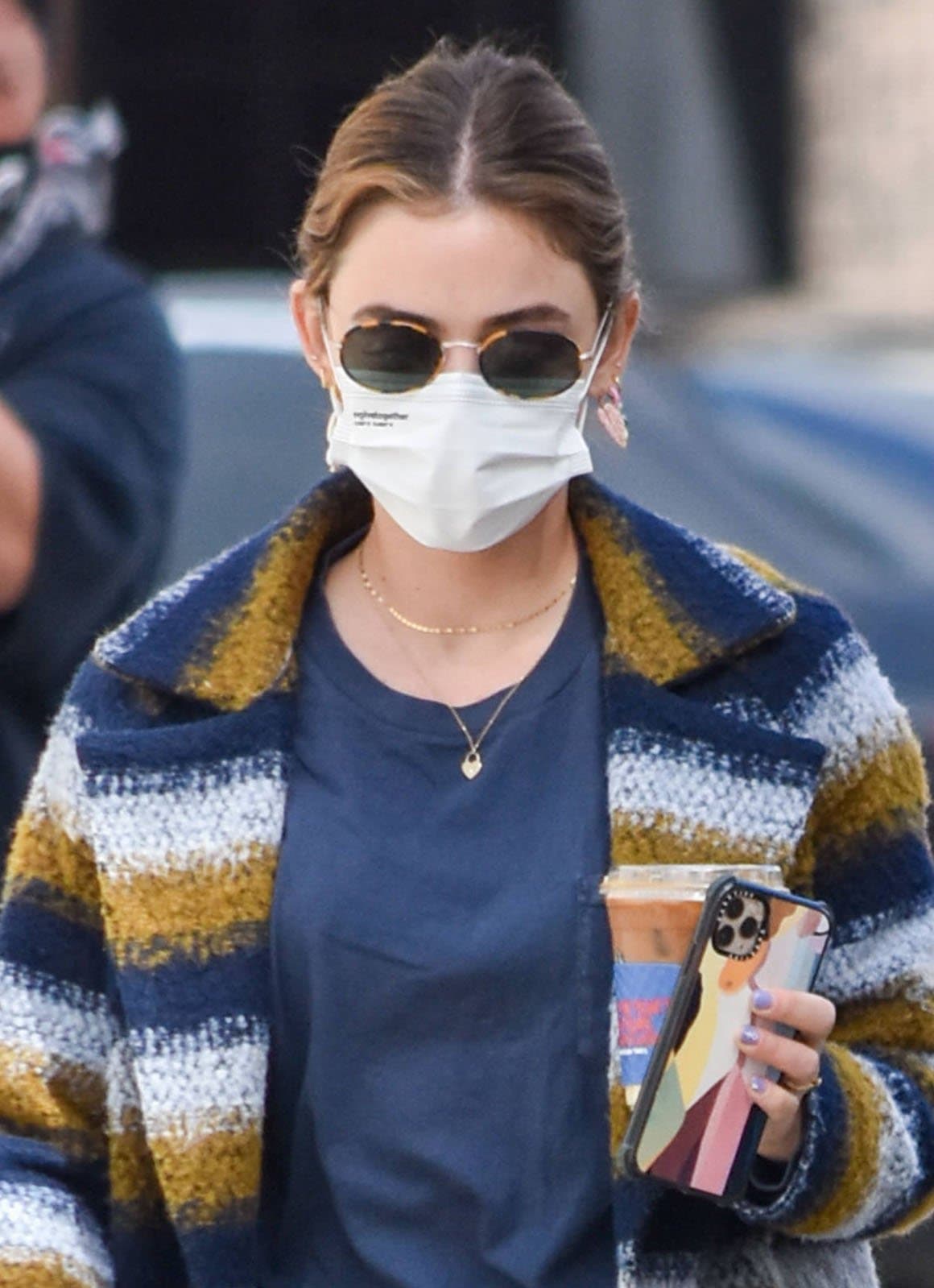 Wearing her hair down, Lucy accessorized with gold necklaces and pink earrings. She also had her sunglasses perched on her head as she kept her mouth and nose covered with a black face mask.