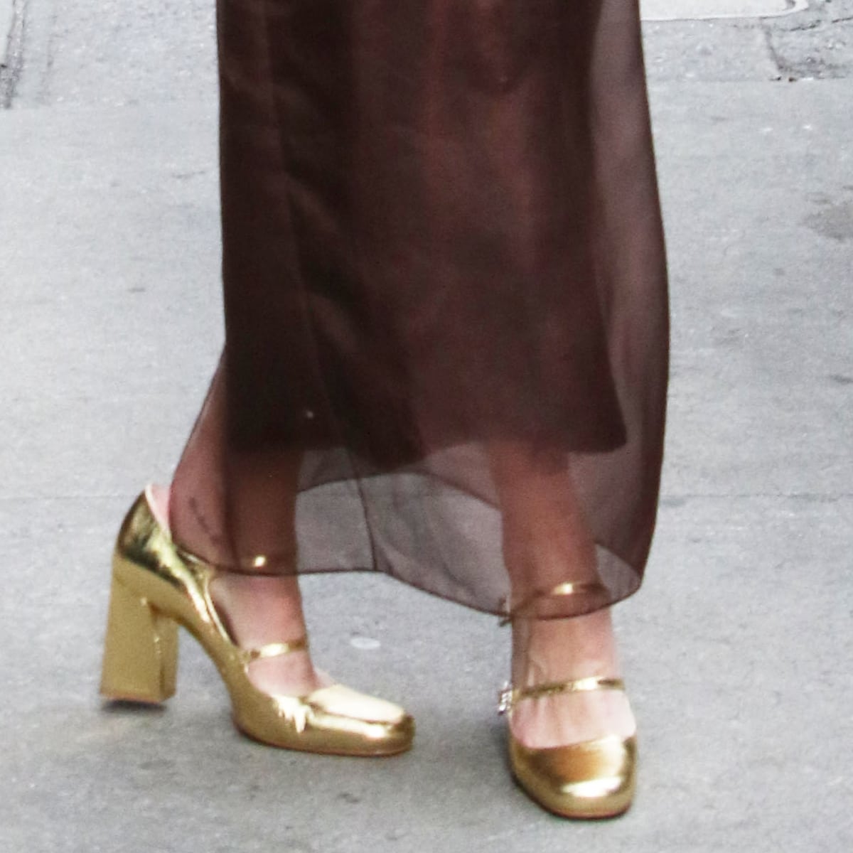 She elegantly paired her attire with Roger Vivier’s gold metallic leather mini Tres Vivier Mary Janes 85, featuring block heels and a crystal-embellished buckle fastening.