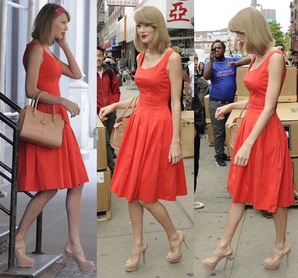 Taylor sported a vermilion red cotton-blend A-line dress from Oscar de la Renta, which features a fitted waist, a scoop neck, darts to the chest, a pleated skirt, a sleeveless design, and an invisible back zip fastening.