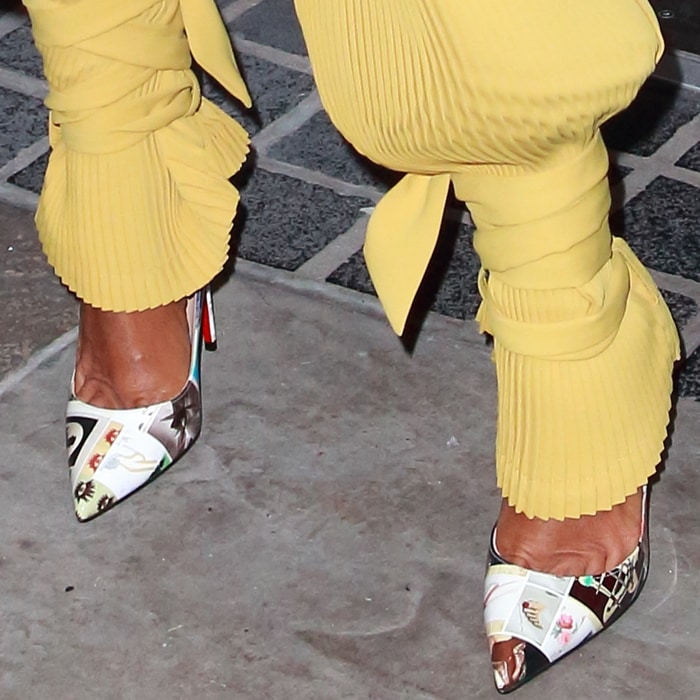 She styled her So Kate heels with a chic yellow shirt featuring dramatic flared sleeves and matching pants.
