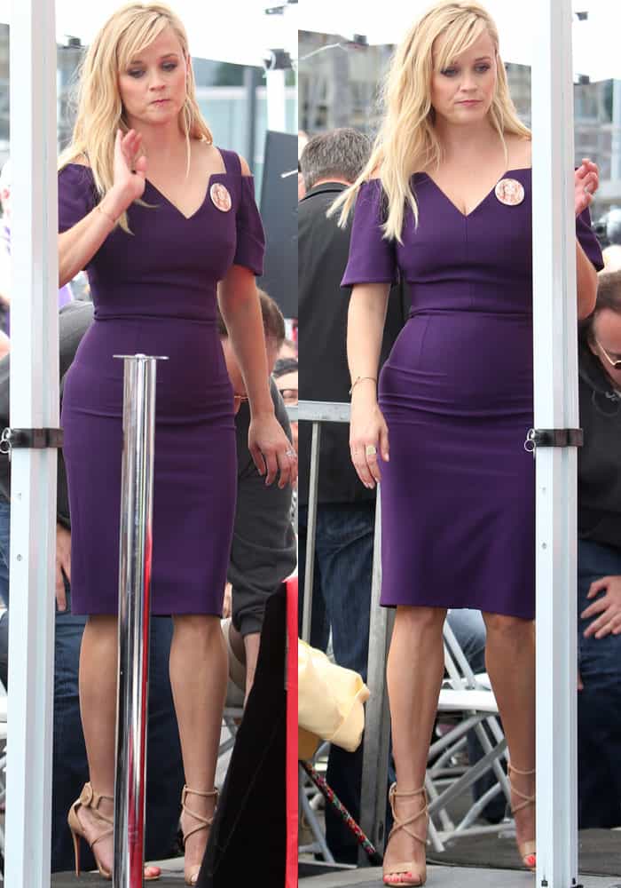 Reese chose a bold color for the event, slipping into the purple version of Roland Mouret’s “Awalton” dress. The cold-shoulder dress highlighted Reese’s beautiful neckline and shoulders and hugged her body snuggly in all the right places.