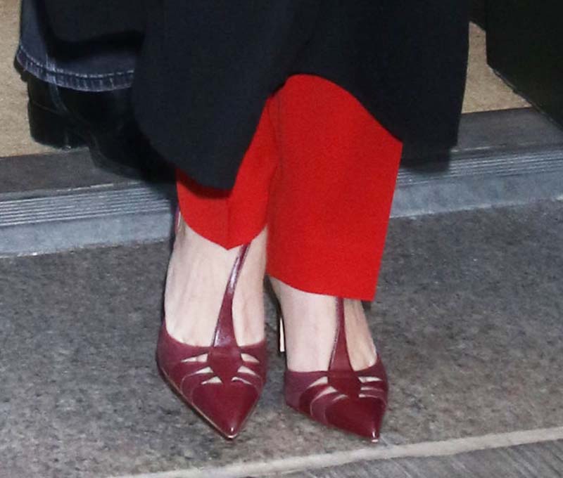 Witherspoon tied the look with burgundy pumps by Carolina Herrera. They are made of leather with tonal suede detailing, pointed toes with cutouts, T-bar straps, and ankle straps with metallic Initials Insignia buckle fastenings.