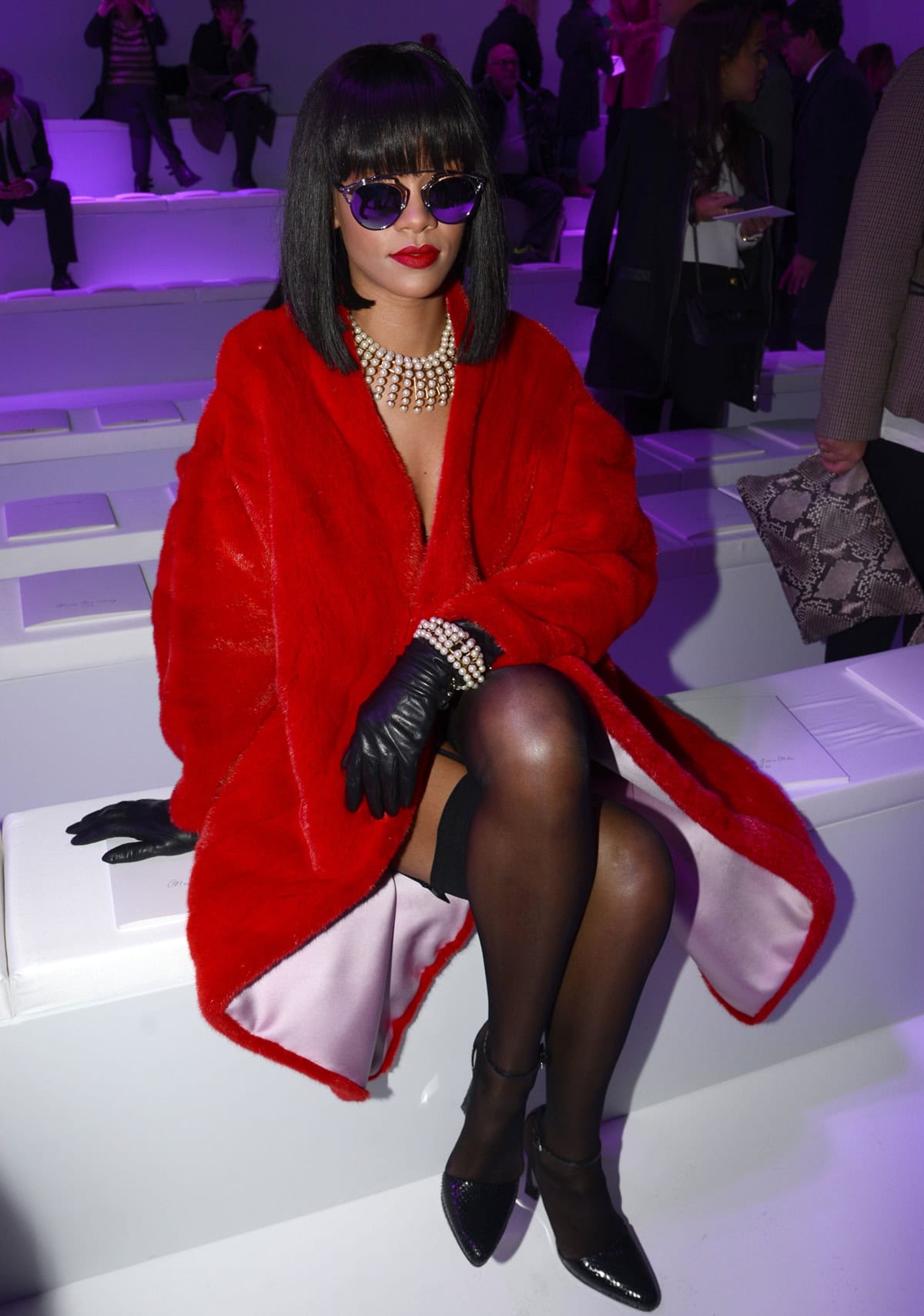 Rihanna attended the Christian Dior show in Paris on February 28, 2014, wearing Dior So Real sunglasses, a Dior Pre-Fall 2014 outfit, Wolford Individual 10 stockings, Dior Fall 2014 sandals, and a Dior Pre-Fall 2013 necklaceRihanna attended the Christian Dior show in Paris on February 28, 2014, wearing Dior So Real sunglasses, a Dior Pre-Fall 2014 outfit, Wolford Individual 10 stockings, Dior Fall 2014 sandals, and a Dior Pre-Fall 2013 necklace (Credit: INFphoto)