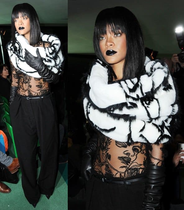 Rihanna stunning in a sheer lace top, black pants, and a striking fur stole at the Jean-Paul Gaultier showRihanna stunning in a sheer lace top, black pants, and a striking fur stole at the Jean-Paul Gaultier show on March 1, 2014 (Credit: SIPA / WENN)
