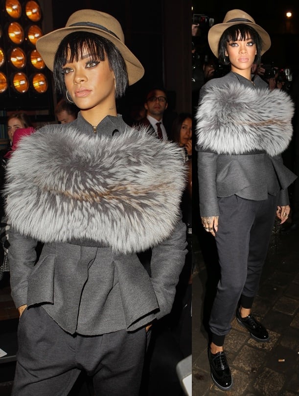 Rihanna rocks a chic gray ensemble with a statement fur stole and a stylish hat at the Lanvin show during Paris Fashion Week 2014Rihanna rocks a chic gray ensemble with a statement fur stole and a stylish hat at the Lanvin show during Paris Fashion Week 2014 (Credit: Audrey Poree / Abaca / Startraksphoto)