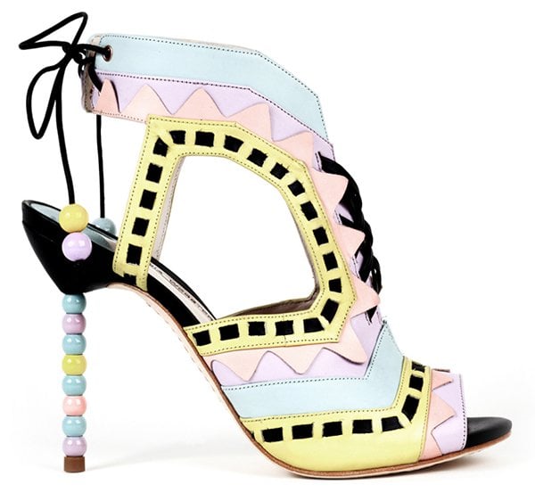 The “Riri” sandals are from the designer’s Spring 2013 collection and feature lemon, purple, coral, and turquoise pastel shades. They also boast baubles and black laces at the front and back.